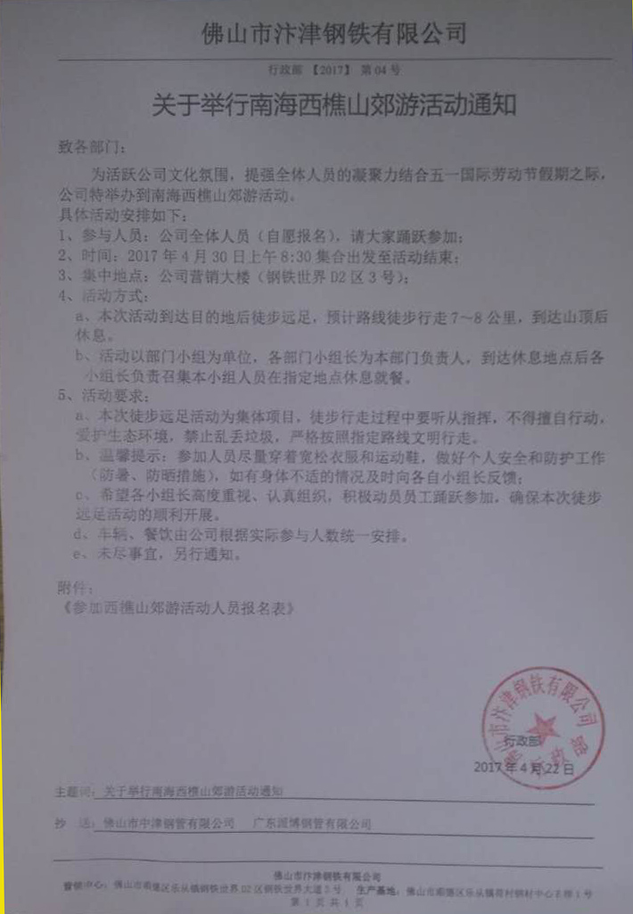 您当前的位置:中欧体育厂家 - 钢材世界 - 公司新闻 - 汴津钢铁-南海西樵山郊游活动通知