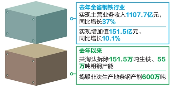 从运行情况看,全省钢铁行业运行平稳趋好。去年,全省钢铁行业实现主营业务收入1107.7亿元,同比增长37%。全行业实现增加值151.5亿元,同比增长10.1%,自2013年以来首次呈两位数增长。主要产品产量稳步提高,其中,生产生铁1322万吨,增长3.5%;粗钢1517.5万吨,增长7.1%;钢材1607万吨,下降2.9%;生产铁合金94.5万吨(含工业硅60万吨),增长28.7%;生产铁矿石原矿量2717万吨,增长16.4%。